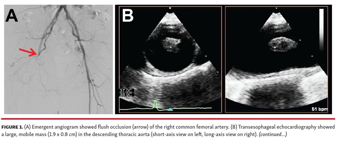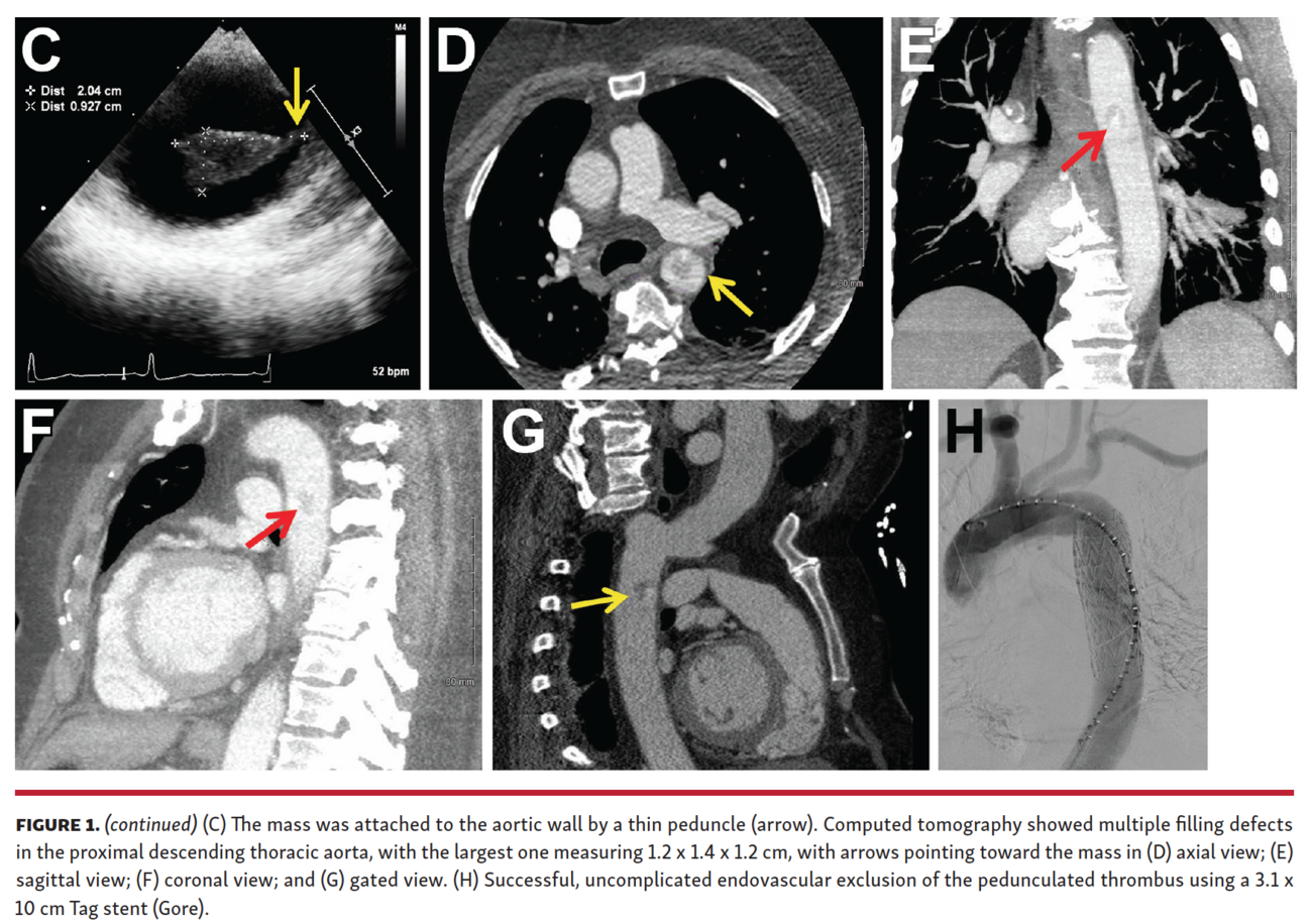 A 57-year-old woman was suspected of having embolic acute limb ischemia. An emergent angiogram showed flush occlusion of the right common femoral artery (Figure 1A). Surgical embolectomy was performed successfully, and pathology confirmed that the evacuated specimen was a blood coagulum. An exhaustive work-up for the embolic source was unrevealing until a transesophageal echocardiogram was obtained that showed a large, mobile mass (1.9 x 0.8 cm) in the descending thoracic aorta (Figure 1B; Videos 1 and 2) attached to the aortic wall by a thin peduncle (Figure 1C). Computed tomography showed multiple filling defects in the proximal descending thoracic aorta (Figures 1D-1G), with the largest measuring 1.2 x 1.4 x 1.2 cm. A complete hypercoagulable panel and age-appropriate cancer screening were both negative. The etiology of the mass was unclear; however, given the thromboembolic event, she underwent a successful, uncomplicated endovascular exclusion of the pedunculated thrombus using a 3.1 x 10 cm Tag stent (Gore) (Figure 1H). She was discharged on warfarin with a goal international normalized ratio of 2-3.