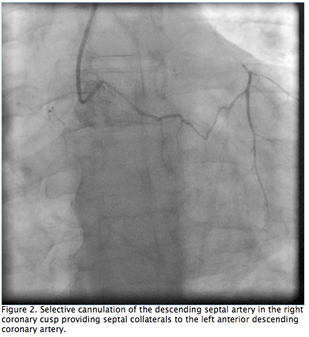 Figure 2. Selective cannulation of the descending septal artery in the right coronary cusp providing septal collaterals to the left anterior descending coronary artery (click thumbnail to view larger image).