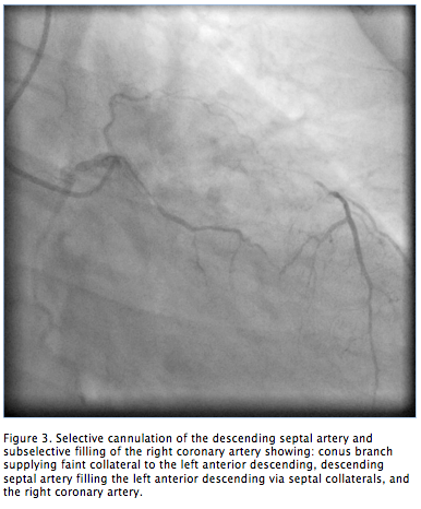 Figure 3. Selective cannulation of the descending septal artery and subselective filling of the right coronary artery showing: conus branch supplying faint collateral to the left anterior descending, descending septal artery filling the left anterior descending via septal collaterals, and the right coronary artery (click thumbnail to view larger image).