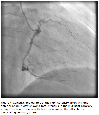 Figure 4. Selective angiograms of the right coronary artery in right anterior oblique view showing focal stenosis in the mid right coronary artery. The conus is seen with faint collateral to the left anterior descending coronary artery (click thumbnail to view larger image).
