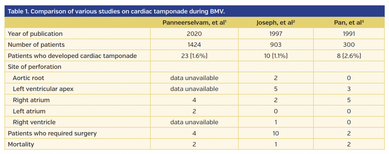 I read with interest about the hemopericardium following transseptal puncture during balloon mitral valvotomy (BMV), their management strategies and outcomes by Panneerselvam et al.1 I want to congratulate the authors for addressing this complication. However, there are certain issues that need to be clarified regarding the hemopericardium during transseptal puncture. First, the authors should have focused more on the mechanism of cardiac perforation during transseptal puncture and noted how many patients had “stitch phenomenon” as a cause of hemopericardium during BMV, which is a rare complication when the needle pierces the intrapericardial space from the right atrial side and re-enters the left atria. Second, the authors might have forgotten to acknowledge the large study by Joseph et al.2 Although the study design was different from the present study, Joseph et al2 elegantly published the mechanisms of cardiac perforation in 10 cases (1.1%) of cardiac tamponade in a single-center series of 903 BMV procedures. In Table 1, I tried to compare various large studies on tamponade during BMV, including the site of perforation and mortality after tamponade.