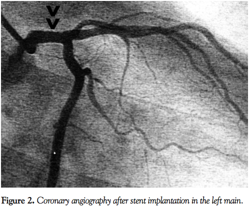 All 34 patients included in the study and treated percutaneously received aspirin (100 mg) and clopidogrel (300 mg) before the procedure and 50 to 80 IU/kg intra-arterial bolus of unfractionated heparin at the start of PCI. The ostium of the LM was treated in 7 patients (21%), the body of the LM in 2 patients (6%), and the distal part of the LM in 25 patients (74%). Direct coronary stenting with implantation of only one stent covering the LM and proximal part of the left anterior descending artery (if needed) was the primary technique used in this study.6,7 Stents with a nominal diameter of 3.5 to 4.5 mm were used (Figures 1 and 2). High-pressure balloon postdilation or kissing-balloon postdilation were used at the operator’s discretion. The following drug-eluting and bare-metal stents were used: Xience Prime Coronary Stent System (Abbott Vascular), BioMatrix (Biosensors International), FlexMaster F1 coronary stent (Abbott Vascular), and Coroflex Blue (B. Braun). Three bare-metal stents and 31 drug-eluting stents were used. After PCI, aspirin, statins, and other optimal medical treatments were prescribed to all patients. Clopidogrel 75 mg/day was prescribed for 1 month after the implantation of bare-metal stents and for 6 to 12 months after the implantation of drug-eluting stents.