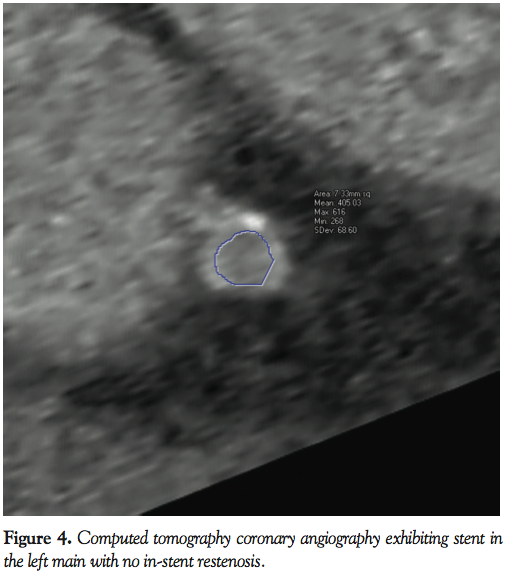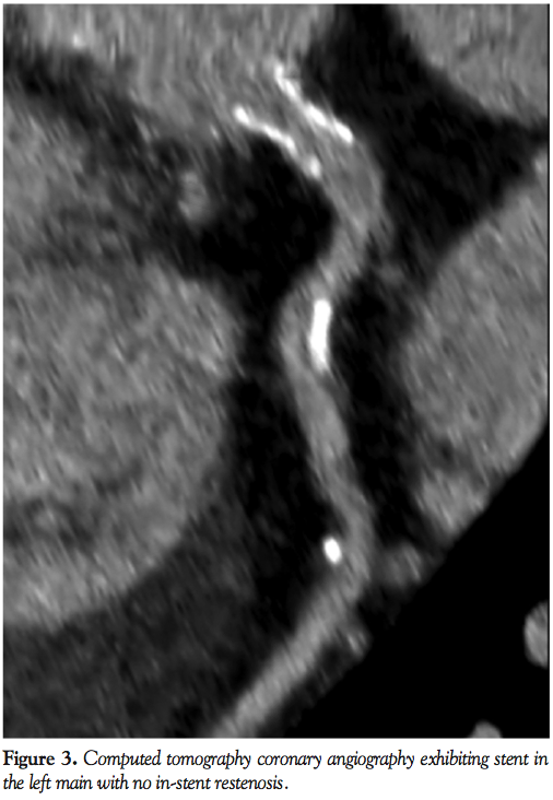 Percutaneous coronary intervention (PCI) is an alternative to surgical revascularization in a certain subset of patients who have significant stenosis of the left main (LM) coronary artery.1,2 Although several investigators have reported the safety and feasibility of this procedure, there is still ongoing debate about the most appropriate follow-up strategy in these patients.3-6 Several investigations have analyzed the diagnostic performance of computed tomography (CT) in assessing stent patency or the presence and severity of in-stent restenosis.3,5 Therefore, it has been recommended that the majority of them should be scheduled for routine control CT or invasive angiography within 3 to 12 months.1
