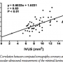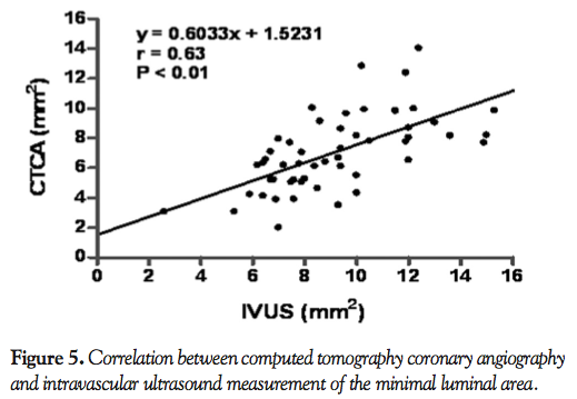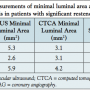predictive values, accuracy, and likelihood ratios of CTCA and CAG for detecting significant restenosis are summarized in Table 3. There was a moderate correlation between the MLAs of stented LM measured by IVUS and CTCA (r = 0.63; P<.01) (Figure 5). A Bland-Altman analysis showed that the MLA measured by CTCA was underestimated (mean difference, 2.14 ± 2.24 mm2) (Figure 6). There were no differences in the evaluation of the different stents used in this study.