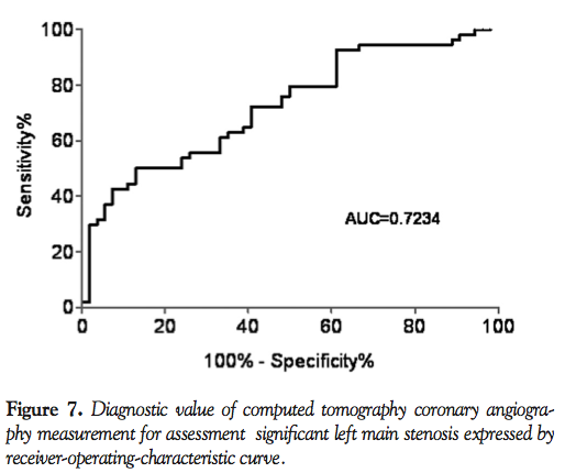ROC analysis of the MLA derived by CTCA for detecting anatomically significant stenosis (<6 mm2) according to IVUS was performed. The AUC was 0.72 (95% CI, 0.63-0.82) and the best cutoff value was 6.68 mm2, with a sensitivity of 50% and a specificity of 87% (Figure 7).
