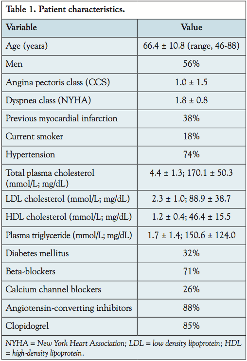A total of 34 patients safely underwent PCI and 56 subsequent complete examinations. Twelve patients underwent only one follow-up examination (3 to 6 months after PCI) while 22 patients had both examinations (3 to 6 and subsequently 9 to 12 months after PCI). The median length between PCI and the follow-up examination was 6 months (mean, 6.9 ± 3 months). Baseline clinical variables of these patients are summarized in Table 1.