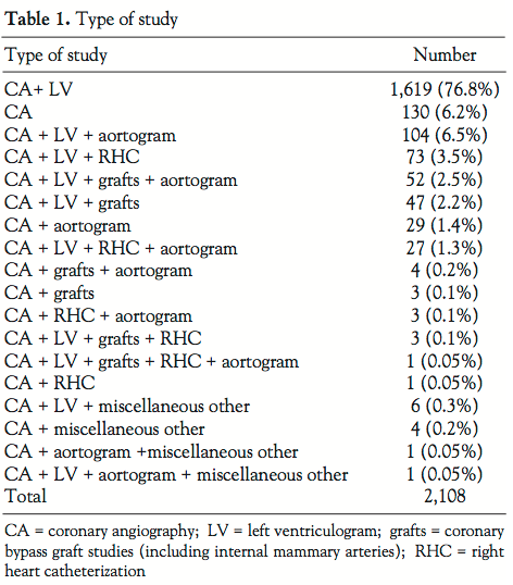 Study group. A total of 2,108 sequential patients undergoing cardiac catheterization in a regional cardiothoracic center between April 1998 and April 1999 were enrolled in the study, which was approved by the local Ethics Committee. Cardiac catheterization was performed by an operator who was blind to the contrast agent in use by suspension of the bottle in an opaque sleeve. Demographic data were collected for each patient entering the study. Patients with a history of previous allergy to contrast agents were treated according to our catheter laboratory policy with hydrocortisone and chlorpheniramine. Patients were not routinely sedated prior to cardiac catheterization. The type of study was dependent on the clinical information required (Table 1). Coronary angiography was performed from any arterial route using standard 6 French (Fr) catheters. Left ventriculography was performed according to our catheter laboratory protocol of a 36 ml bolus of contrast agent injected at 12 ml/second. Each week was randomly assigned as a week when one of the different contrast agents was used. Patients who had received any contrast agent within the previous week were excluded from analysis.