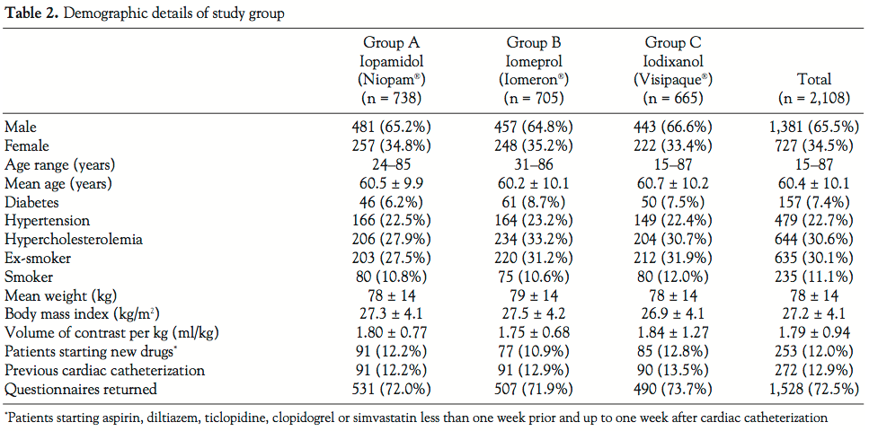 There were no significant differences in the baseline characteristics of the study groups (Table 2). The groups contain different numbers of patients due to the randomization process, which assigned a particular contrast agent to be used during each week of the study. Although the numbers of weeks assigned to each agent were the same, the numbers of patients are different because of variations in the numbers of patients undergoing diagnostic procedures each week. A total of 12.9% of patients had undergone previous cardiac catheterization, but there was no significant difference in the incidence of previous cardiac catheterization between the 3 groups. Only 6 patients in the whole study group were pre-treated with hydrocortisone and chlorpheniramine because of a previous possible allergic reaction to a contrast agent.
