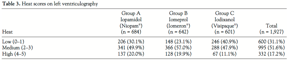 Heat reactions. Of the 1,933 patients in whom left ventriculography was performed, a total of 1,927 (99.7%) were able to score the resulting heat sensation on a scale of 0–5 (Table 3), the remaining 6 patients being unable to make a score. Seven patients did require sedation with morphine during cardiac catheterization for anxiety or chest pain and this may have made the heat score unreliable in those patients. Iopamidol 340 (Niopam®) and iomeprol 350 (Iomeron®) caused very similar heat sensation, but heat sensation was less intense with iodixanol 320 (Visipaque®) (p < 0.01).