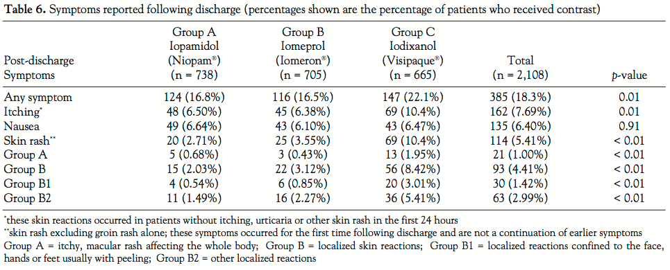 Skin reactions. The incidence of skin reactions of any kind and the incidence of itching were both significantly higher in the group receiving iodixanol 320 (Visipaque®) than in the groups receiving either iomeprol 350 (Iomeron®) or iopamidol 340 (Niopam®). Skin reactions of any kind and itching both occurred with an incidence of 10.4% in the iodixanol 320 (Visipaque®) group. The incidences in the other 2 groups were between 2.7% and 6.5%. There was no significant difference in the volume of contrast agent received by those patients with late skin reactions compared to those patients who did not have a late skin reaction [mean, 134 ml and 95% confidence interval (CI), 126–143 ml versus mean, 135 ml and 95% CI of 123–138 ml]. Similarly, there was no significant difference in the volume of iodixanol 320 (Visipaque®) received by those patients with late skin reactions compared to those patients receiving this agent who did not have a late skin reaction (mean of 134 ml and 95% CI of 125–143 ml versus mean of 137 ml and 95% CI of 130–144 ml). There were 21 patients (Group A) with a widespread, itchy macular rash, sometimes with skin peeling or flaking. The other 93 patients (Group B) had localized reactions, associated with blistering, skin peeling or skin flaking.