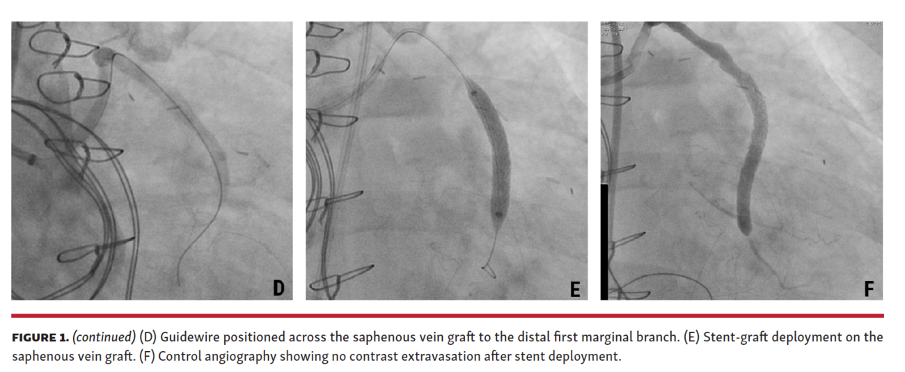 Angiography demonstrated important contrast leakage from the distal body of the saphenous vein graft to the first marginal branch (Figures 1A-1C; Video 1). Remaining grafts were patent. After a cardiac arrest responsive to cardiopulmonary resuscitation during the angiography, we elected to proceed with percutaneous treatment. Using an 8 Fr, JR 4.0 guiding catheter, a 5.0 x 38 mm Atrium Advanta V12 stent-graft (Getinge) was released at the bleeding site. Control angiography showed no contrast extravasation and Thrombolysis in Myocardial Infarction 3 flow (Figures 1D-1F; Video 2). The patient responded with rapid hemodynamic improvement. Subsequently, she developed multiple complications and died 50 days after coronary artery bypass graft surgery.
