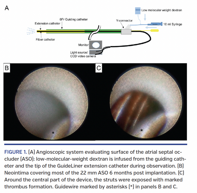 The Amplatzer atrial septal occluder (ASO; St. Jude Medical) is a commonly used device for percutaneous transcatheter closure of ASDs worldwide; however, to our knowledge, there is currently no in vivo angioscopic investigation that can accurately assess the degree of endothelialization. Therefore, we set out to evaluate the neointimal coverage of ASO using angioscopy (Visible; Fiber Tech Co, Ltd) from a right atrial access (Figure 1A) in a 78-year-old woman with a 22 mm ASO implanted 6 months prior.