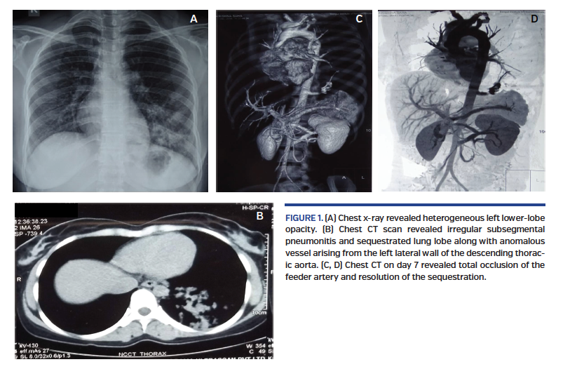 A 25-year old woman presented with recurrent chest infections since childhood. She had been experiencing increased frequency of infections and hemoptysis for 1 year and had received multiple courses of antibiotics. Physical examination revealed mild pallor. Routine blood investigations revealed a hemoglobin of 7.8 g/dL with normal kidney and liver function tests. A chest x-ray revealed heterogeneous left lower-lobe opacity (Figure 1A). Computed tomography (CT) scan of the chest revealed irregular subsegmental pneumonitis in the posterior basal segment of the left lower zone, with sequestrated lung lobe along with anomalous vessel arising from the left lateral wall of the descending thoracic aorta (Figure 2). An aortogram with selective dye injection identified the feeder vessel (Video 1).