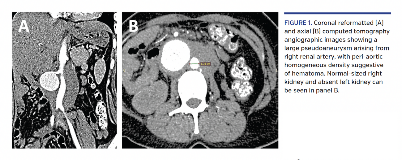 A 30-year-old woman presented with right lumbar region abdominal pain of 2-month duration. Her chronic hypertension of 13-year duration was treated medically with telmisartan, amlodipine, metoprolol, and diuretics. Abdominal exam revealed right lumbar pulsatile mass. Her serum creatinine and estimated glomerular filtration rate (eGFR) were 1.73 mg/dL and 42 mL/min/1.73 m2, respectively. Computed tomography (CT) scan revealed absent left kidney and left renal artery, normal-sized right kidney, and a large (43 x 48 mm) right renal artery pseudoaneurysm with periaortic hematoma, suggesting an impending rupture (Figure 1). Serum tests for autoimmune disease and inflammatory large cell arteritis were negative. There was no history of blunt trauma abdomen or any abdominal surgery in the past.