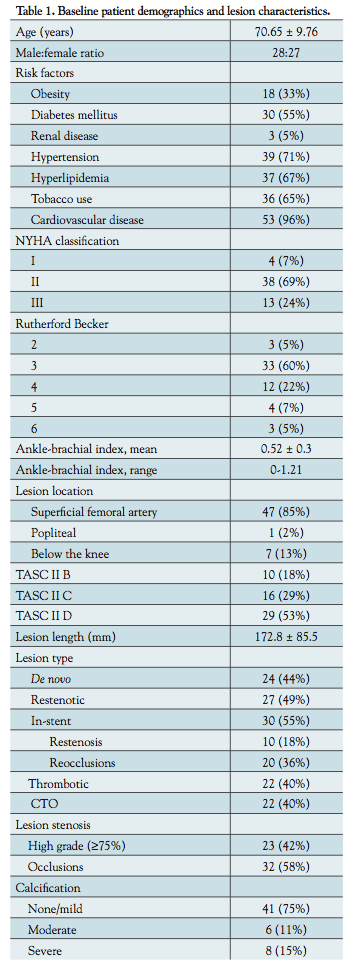 Patient sample. Baseline data (Table 1) were collected (28 males; mean age, 70.6 years; age range, 50-87 years). Seven subjects presented with open and non-healing wounds, 12 had severe ischemic rest pains, 33 had severe claudication, and 3 had moderate claudication. There were 29 TASC II D lesions, 16 TASC II C lesions, and 10 TASC II B lesions; 24 de novo lesions, 27 restenotic lesions, and 10 in-stent restenotic lesions; 20 in-stent re-occlusions, 22 thrombotic occlusions, and 22 chronic total occlusions. Baseline stenosis and average lesion length were 94.24 ± 6.4% and 172.8 ± 85.5 mm, respectively. Forty-one subjects had none to mild calcification, 6 had moderate calcification, and 8 had severe calcifications.