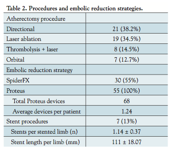 Study design. Data from this single-arm, single-center retrospective study were collected from 55 unselected, consecutive, lower-extremity atherectomy interventions conducted between November 2011 and November 2012. The data went through statistical analysis to assess common embolic reduction devices implemented at our center.