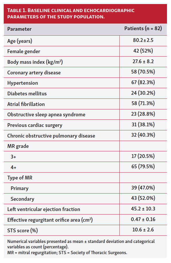 All patients (39 primary severe MRs and 43 secondary severe MRs) underwent TMVRep under MCS with an acute procedural success rate of 100%. Mean age was 80.2 ± 2.5 years, 42 (52%) were women, and 70.5% had coronary artery disease. The mean LVEF was 45.2 ± 10.3%. MR grade was 3+ in 20.5% and 4+ in 79.5% of patients. Baseline clinical and demographic features of the study population are presented in Table 1.