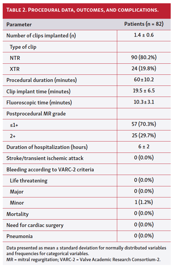 A mean of 1.4 ± 0.6 clips were implanted per patient (range, 1 to 2 clips). Postprocedural MR grade was 1+ or lower in 57 patients (70.3%) and 2+ in 25 patients (29.7%). Mean procedural duration, clip implant time, and fluoroscopic time were 60 ± 10.2 minutes, 19.5 ± 6.5 minutes, and 10.3 ± 3.1 minutes, respectively. None of the procedures were converted to general anesthesia, and all patients included in the study had SDD. Procedural data, outcomes, and complications are shown in Table 2.