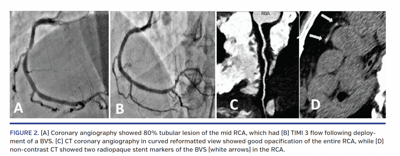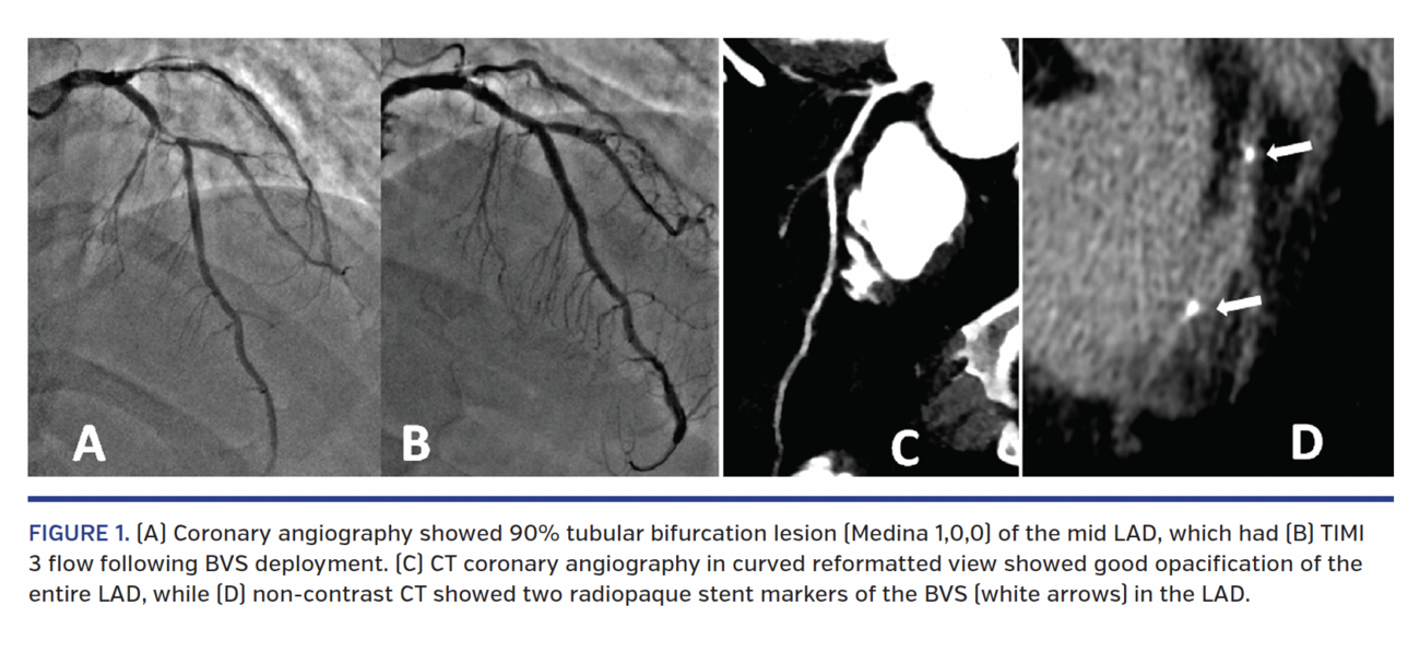 A 39-year-old diabetic, hypertensive male presented with chronic stable angina class II, with a positive exercise treadmill test. His clinical examination was unremarkable. Two-dimensional echocardiography revealed no regional wall-motion abnormality and left ventricular ejection fraction of 60%. Coronary angiography revealed 90% tubular bifurcation lesion (Medina 1,0,0) of the mid left anterior descending (LAD) (Figure 1A) and 80% tubular lesion of the mid right coronary artery (RCA) (Figure 2A). A 3.5 x 28 mm Absorb bioresorbable vascular scaffold (Abbott Vascular) was deployed across the mid LAD, followed by final kissing-balloon inflation between the LAD and first diagonal (D1). A 3.5 x 28 mm Absorb BVS was deployed across the mid RCA. Both arteries had TIMI 3 flow and no angiographic residual stenosis (Figures 1B and 2B). The patient remained asymptomatic during regular follow-up visits. A 128-slice dual-source computed tomography coronary angiogram (CTCA) at 5-year follow-up exam showed normal caliber and flow across the LAD and RCA (Figures 1C and 2C). As the Absorb BVS does not have an artifact on CTCA (like metallic stents), the extent/location of the stent in situ can only be assessed by localizing the proximal and distal radiopaque platinum markers in a non-contrast CTCA. The two markers on each stent are visualized as radiopaque dots at the proximal and distal ends of the BVS, across the intervened coronary arteries (Figures 1D and 2D). This characteristic appearance of BVS on CTCA should be interpreted as the footprint of a disappeared BVS, instead of a calcified plaque.