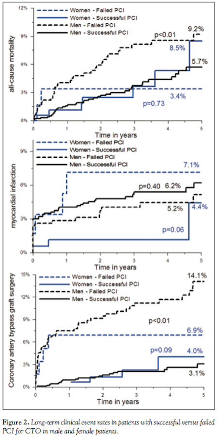 This analysis from the large Multinational CTO Registry studied the largest cohort of female patients undergoing CTO PCI to date and showed that after multivariate adjustment, success rates of CTO PCI are similar in men and women. Moreover, successful CTO PCI was associated with reduced need for CABG and reduced mortality in male patients. In women, successful CTO PCI was associated with a statistical trend toward less CABG surgery. The long-term occurrence of MACE was reduced after successful PCI in both men and women. However, we observed a significant interaction between gender and procedural success in terms of MACE, indicating men may have greater benefit of successful percutaneous revascularization of a CTO.