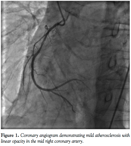The patient is a 62-year-old man with hyperlipidemia, who was admitted with acute exacerbation of chronic obstructive pulmonary disease needing mechanical ventilation and support with cardiac pressor. He sustained a non-ST elevation myocardial infarction with peak troponin at 1.2 ng/mL. Echo windows could not be obtained due to lung hyperinflation. After extubation 24 hours later, he underwent cardiac catheterization. Angiogram demonstrated only mild atherosclerosis with non-flow limiting linear opacity in the mid-segment of the