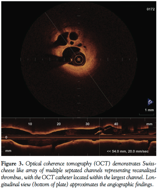 - Cho JM, Raffel OC, Stone JR, et al. Spontaneous recanalization of a coronary artery after thrombotic occlusion: in vivo demonstration with optical coherence tomography. J Am Coll Cardiol. 2010;55(12):1274.
