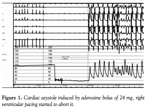 Limitations. This is a pilot study and the limited number of patients is therefore too small to be powered to demonstrate any significant difference between the two adenosine dosages (high vs. low). The limited number of patients can also have played a role in the assessment of adenosine feasibility. It is difficult to calculate the real duration of asystole as it was interrupted by ventricular ectopic beats.