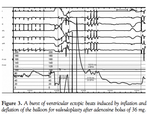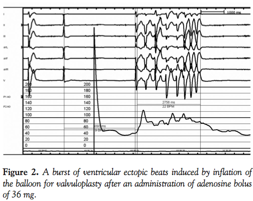 It has already been reported by McKay et al that premature ventricular contractions occur during the period of balloon inflation in all patients who underwent balloon valvuloplasty for treatment of aortic stenosis.7 While the administration of adenosine is effective in creating a sufficiently long period of AV block followed by cardiac asystole, it does not prevent the occurrence of ventricular ectopic beats induced by a mechanical trigger.