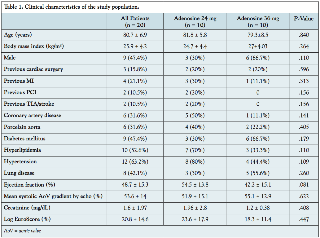 Therefore, adenosine could represent an acceptable alternative to RRVP in selected patients, such as low left ventricular ejection fraction and severe coronary artery disease who may not tolerate the pacing maneuver. The incidence of associated coronary artery disease was about 45% in patients with aortic stenosis who were aged ≥60 years.13 In these patients, RRVP might be not well-tolerated, as it aggravates myocardial ischemia or causes life-threatening arrhythmias requiring direct current cardioversion complicating and delaying aortic valve implantation. The threshold for inducible myocardial ischemia is very low in patients with AoV stenosis because of severe left ventricular hypertrophy and an existing missmatch between the density of coronary microcirculation and supplied myocytes. Therefore, a risk of inducing myocardial ischemia and ventricular arrhythmias with RRVP remains, especially in patients with severe left ventricular dysfunction and coronary artery disease.