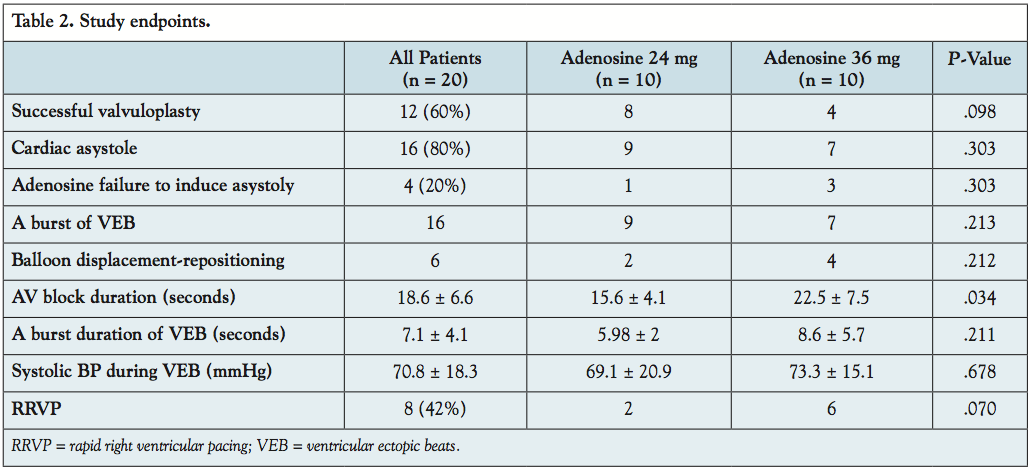 Abstract: Background. Rapid right ventricular pacing (RRVP) at rates above 200 beats/minute is used to suppress cardiac output during balloon aortic valvuloplasty (BAV) in transcatheter aortic valve replacement (TAVI) patients. A risk of inducing myocardial ischemia with RRVP remains, especially in patients with left ventricular dysfunction. Alternatively, a transient cardiac arrest can be achieved with administration of adenosine. Methods. The primary endpoint was successful valvuloplasty defined by complete balloon inflation and deflation across aortic valve during the transient asystole induced by adenosine. Secondary endpoints were defined as the failure of adenosine to induce asystole, the incidence of ventricular ectopic beats (VEB) during balloon inflation or deflation, and balloon displacement. Results. From November 2010 to January 2011, twenty consecutive patients who underwent TAVI were included. A balloon for valvuloplasty was positioned across the aortic valve. A low-dose (24 mg, n = 10) or high-dose (36 mg, n = 10) bolus of adenosine was administrated. A single bolus of adenosine-induced atrioventricular (AV) block (mean duration, 18.6 ± 6.6 seconds) followed by cardiac asystole in 16 patients (80%) (low-dose, n = 9). A successful BAV was achieved in 12 patients (60%) (low-dose, n = 8). Adenosine induced only bradycardia in 4 patients (20%) (low-dose, n = 1). A burst of VEB during BAV occurred in all patients. Balloon displacement occurred in 6 patients (37.5%). Conclusion. BAV after administration of adenosine is feasible, safe, and may represent an option for high-risk TAVI patients in whom RRVP might not be well tolerated. The occurrence of ventricular ectopic contractions triggered by balloon inflation and deflations accounts for balloon displacement and crossover to RRVP.