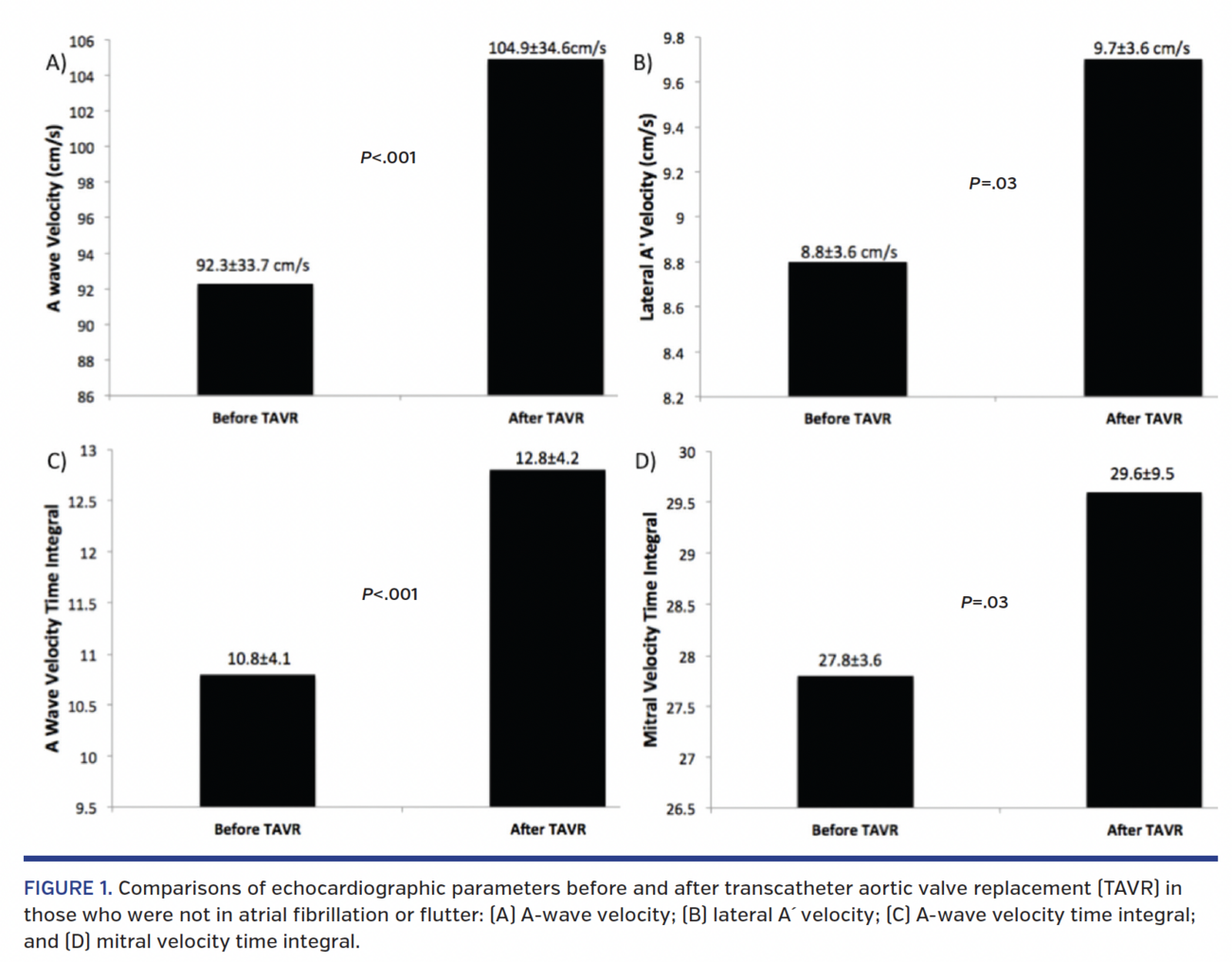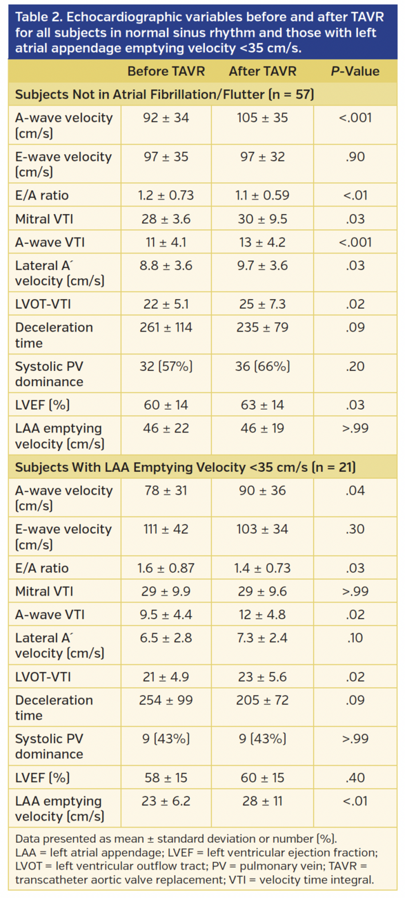 decrease in RVSP (43 ± 16 mm Hg to 40 ± 15 mm Hg; P=.05). One-third (27%) had spontaneous LA echo contrast, 1.2% had LAA sludge (pre-clot), and 3.5% had LA thrombus. Comparisons of echocardiographic parameters before and after TAVR in those who were not in atrial fibrillation or flutter (n = 57) (Table 2) showed a significant increase in A-wave velocity (92 ± 34 cm/s to 105 ± 35 cm/s; P<.001) (Figure 1), mitral inflow velocity time integral (VTI; 28 ± 3.6 to 30 ± 9.5; P=.03), A-wave VTI (11 ± 4.1 to 13 ± 4.2; P<.001), lateral A´ velocity (8.8 ± 3.6 cm/s to 9.7 ± 3.6 cm/s; P=.03), LVOT-VTI (22 ± 5.1 to 25 ± 7.3; P=.02), and LVEF (60 ± 14% to 63 ± 14%; P=.03). There was a decrease in E/A ratio (1.2 ± 0.7 to 1.05 ± 0.6; P<.01) after TAVR.