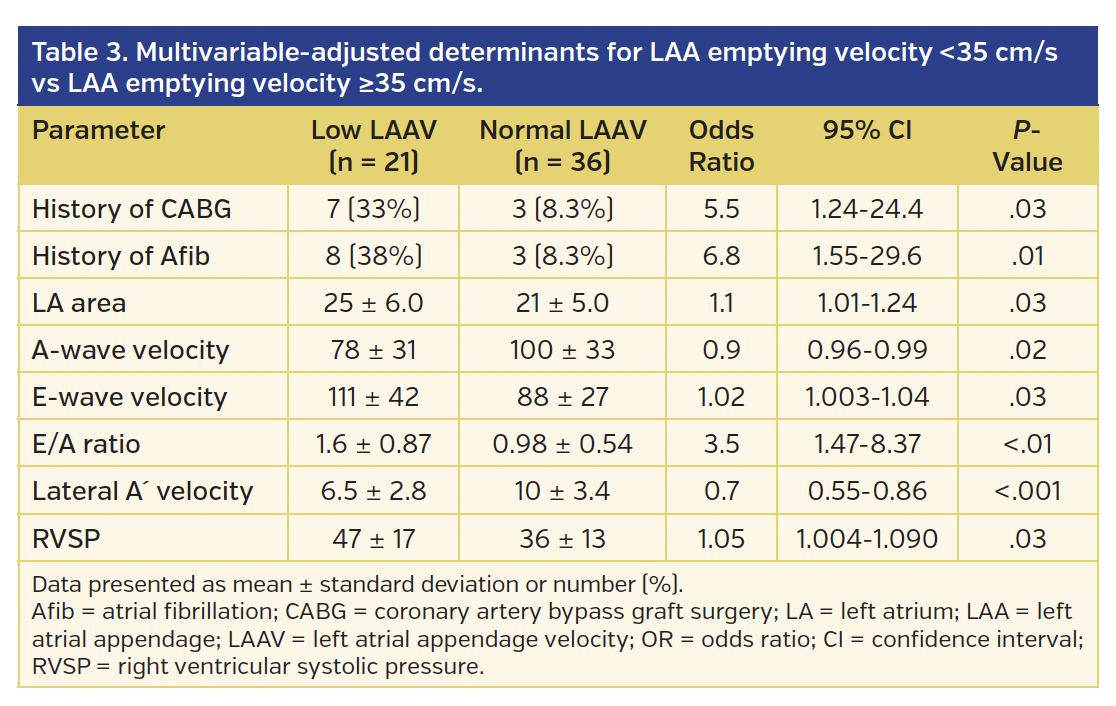 We compared those with LAA emptying velocity <35 cm/s vs ≥35 cm/s (Table 3) to determine predictors of low LAA emptying velocity (<35 cm/s). Those with LAA emptying velocity <35 cm/s were more likely than those with LAA emptying velocity ≥35 cm/to have history of coronary artery bypass surgery, history of paroxysmal atrial fibrillation, larger LA size, lower A-wave velocity, higher E-wave velocity, higher E/A