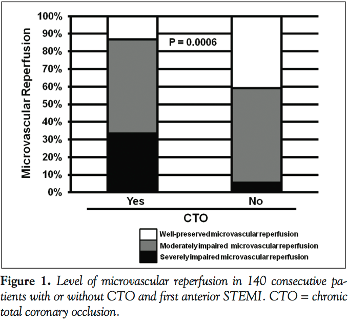 The reported prevalence of chronic total coronary occlusion (CTO) in the community hospital setting is 15%-30%.1,2 A recent large cohort study found that CTO has a profoundly adverse impact on the 1-year mortality rates among patients who undergo percutaneous coronary intervention (PCI) to treat ST-segment elevation myocardial infarction (STEMI) with multivessel disease.3 So far, however, it remains unknown why the presence of CTO manifests adverse clinical outcomes in patients undergoing PCI for STEMI.