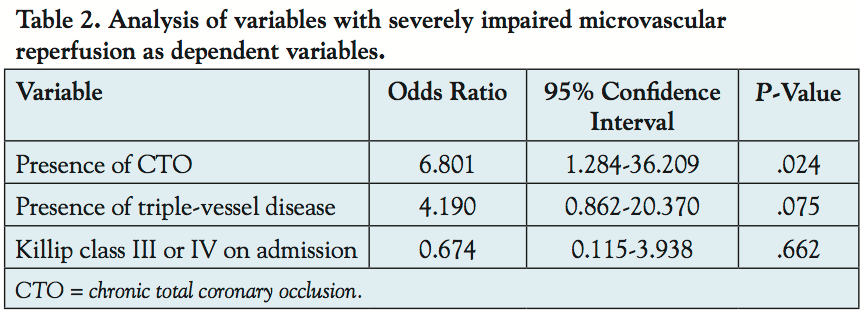 Complication with overt heart failure and/or cardiogenic shock upon admission is more frequent among patients with versus without CTO. A previous study proposed a role for extensive microvascular damage complicated with heart failure in failed microvascular reperfusion associated with STEMI.17 We supposed that a high Killip class would be an independent variable for impaired microvascular reperfusion based on the findings of that study. However, multivariate regression analysis including these variables showed that CTO is mostly associated with incidental severely impaired microvascular reperfusion.