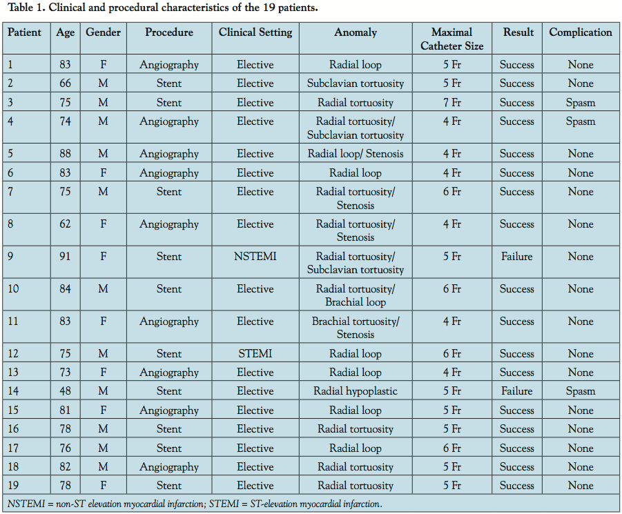 Definitions. Procedural success was defined as completion of the planned procedure through the initially selected radial access route. In case of failure of the TR approach, a TF approach was chosen. Vascular spasm was defined as an inability to manipulate the guidewire or catheter in a smooth and pain-free manner.