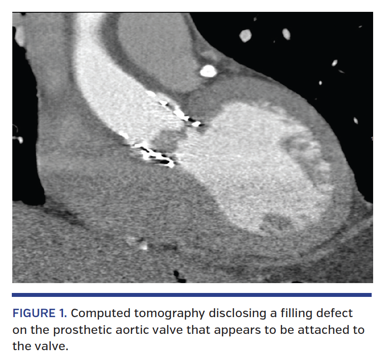 An 86-year-old man with a history of transcutaneous aortic valve implantation (TAVI) 2 years prior to his admission was admitted to our hospital due to weakness and low-grade fever for 1 week. The patient was known to have a higher than normal pressure gradient post TAVI and received anticoagulation for the last year due to suspected post-TAVI valve thrombosis. Two months prior to his admission, the patient was diagnosed at another medical center with bacterial endocarditis of his prosthetic aortic valve, after blood cultures were positive for Enterococcus faecalis. The patient was treated for 4 weeks with daptomycin and was considered disease free. Upon admission to our center, the patient exhibited a third-degree (complete) atrioventricular block on electrocardiogram. The patient was hemodynamically stable and did not require transcutaneous pacing or inotropic support. Echocardiography showed high pressure gradients (100 mm Hg) on the aortic valve, and suspected thrombus or vegetation on the aortic valve. A computed tomography scan with intravenous contrast was performed, showing a large filling defect on the prosthetic aortic valve (Figure 1). Blood cultures drawn at the patient’s admission returned positive for the same Enterococcus faecalis grown at the prior admission. The patient was suspected to have an infected thrombus on a TAVI valve and was referred to urgent surgery. The valve with the infected thrombus (Figure 2) was removed and a biological prosthetic valve was implanted in its place. The procedure and its postprocedural course were uneventful.