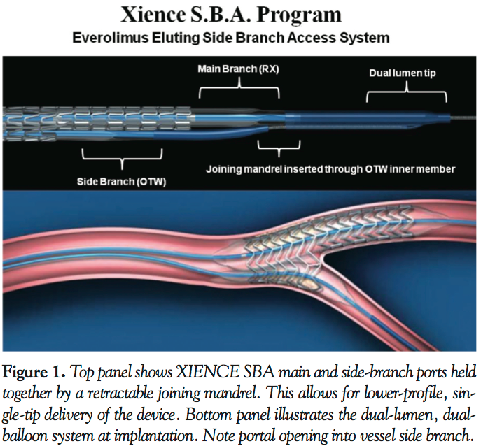 Given the heterogeneity of bifurcation coronary lesions, the XIENCE SBA may offer versatility in the treatment of anatomic variations of disease. The images above demonstrate use of the XIENCE SBA as part of complex 1- and 2-stent strategies. Device deployment as part of a provisional methodology or even as a simple SB preservation technique, while maintaining MB and SB wire position, may underscore the versatility of this novel device. While images shown here give cause for optimism, further studies to define the role of the XIENCE SBA in the treatment of bifurcation coronary disease and to validate device safety and efficacy are warranted.