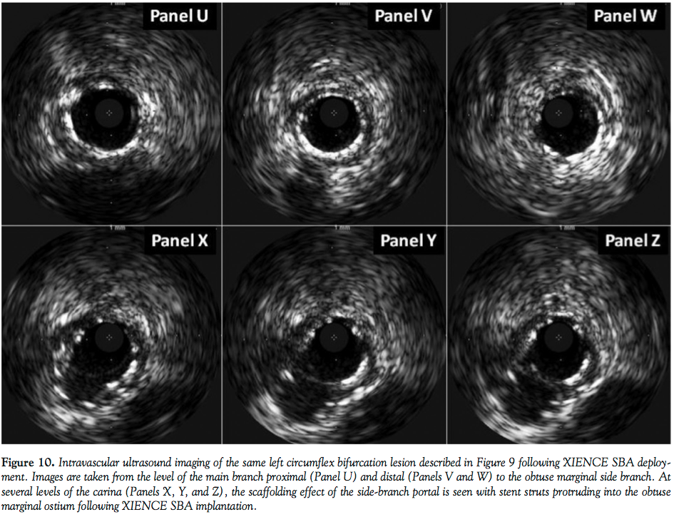 obtuse marginal considered the SB into which the portal opening was deployed. The orientation of XIENCE SBA during inflation is inset into Panel Q. Following high-pressure dilation, the final result is noted in both left anterior oblique caudal and anteroposterior caudal views (Panels S and T). Intravascular ultrasound (IVUS) assessment following final XIENCE SBA inflation is demonstrated in Figure 10, showing the MB proximal (Panel U) and distal (Panels V and W) to the obtuse marginal SB. The sonographic appearance of the portal opening into the SB is appreciated at various levels of the carina (Panels X, Y, and Z) demonstrating ostial SB coverage provided by this 1-2 mm aperture.
