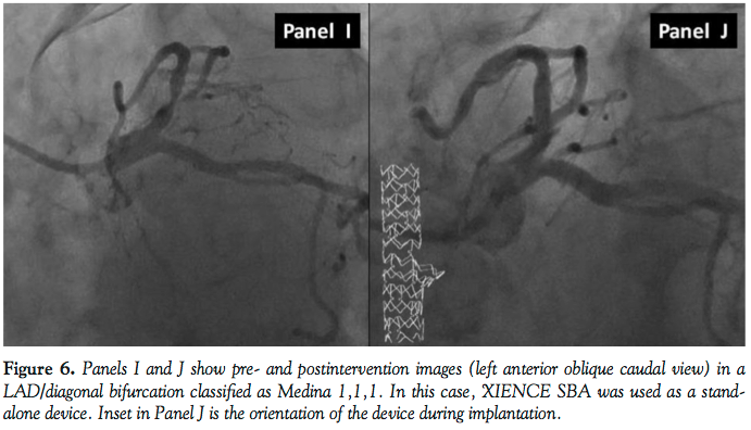 Figure 6 (Panels I and J) demonstrates XIENCE SBA used as a stand-alone device in a LAD lesion with wire preservation of the diagonal artery. In this case, the operator chose to use final alternating balloon inflations in the MB (3.0 NC balloon) and SB (2.5 NC balloon). The final angiographic result as well as the orientation of the device during deployment are shown in Panel J.
