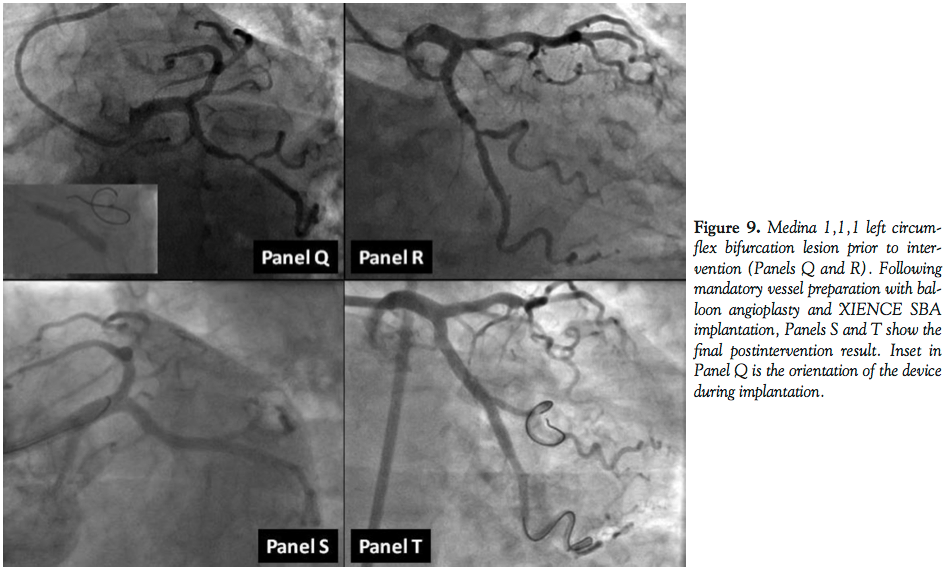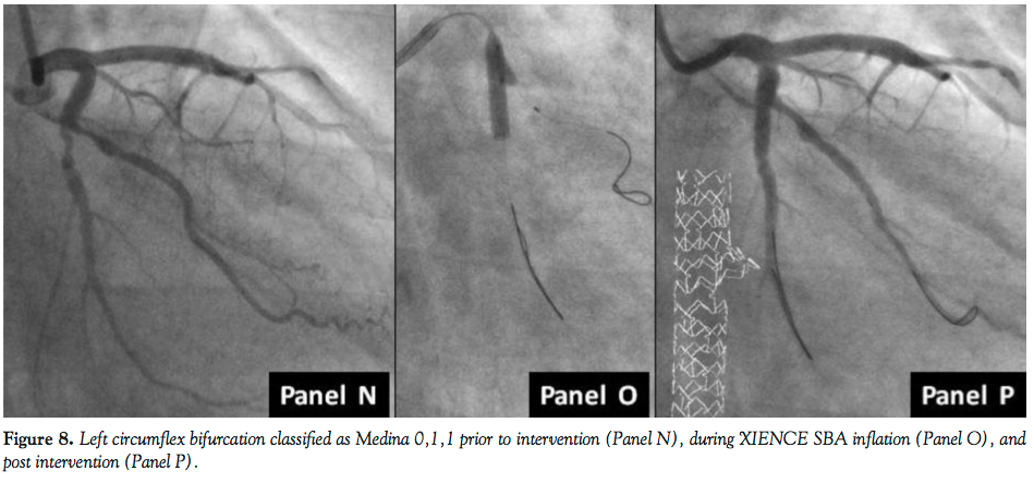 Figure 8 shows XIENCE SBA deployment as part of treating a Medina 0,1,1 lesion. Panel N represents the lesion prior to vessel balloon pretreatment. Following balloon angioplasty of the main branch, the device was inflated at pressures of 14 atm (Panel O) and the final result (Panel P) was achieved with no further postdeployment inflations.