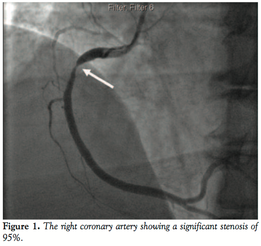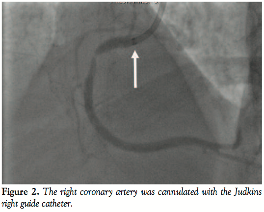 Coronary angiogram revealed a significantly tight stenosis of 95% in the proximal segment of the right coronary artery (RCA) with the other vessels having no significant disease (Figure 1). We treated the culprit vessel percutaneously by cannulating the RCA with a 7 Fr Judkins right guiding catheter (Figure 2) and using a 0.014” Galeo wire (Biotronik) to cross the lesion. The lesion was predilated with 3 mm x 10 mm Sprinter balloon (Medtronic) at 10 atm (Figure 3). However, just after withdrawing the balloon into the