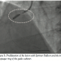 catheter, we noticed that the radiopaque rubber ring, which is attached to the distal end of the guide catheter, was cut off from the catheter (Figure 4). Almost immediately, the same balloon was advanced further beyond the radiopaque ring, inflated to 4 atm to trap the ring, and the whole catheter system was removed through the femoral artery (Figures 5 and 6). The RCA was recannulated and a 3.5 mm x 24 mm Biomatrix stent (Biosensors International) deployed at 16 atm (Figure 7). This was followed by postdilatation of the stented segment with 3.5 mm x 10 mm NC Mercury balloon (Abbott). The procedure was completed successfully without any adverse event. The impending complications related to the remnants of the catheter system were prevented by early recognition of the dehisced radiopaque ring of the guide catheter, which could have caused myocardial infarction, arrhythmias, or sudden death.