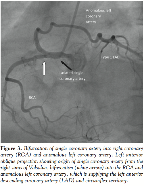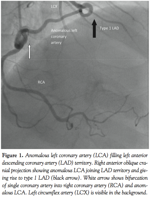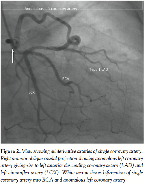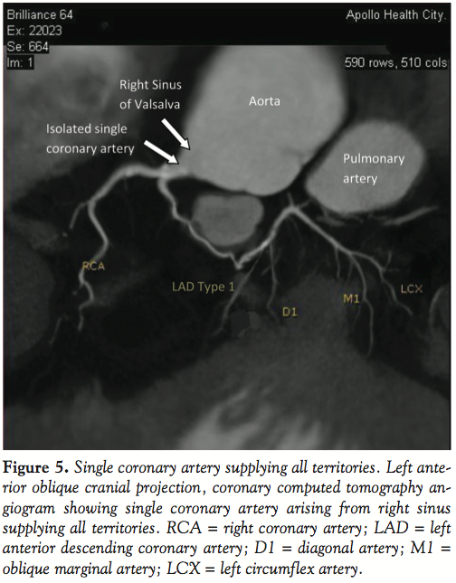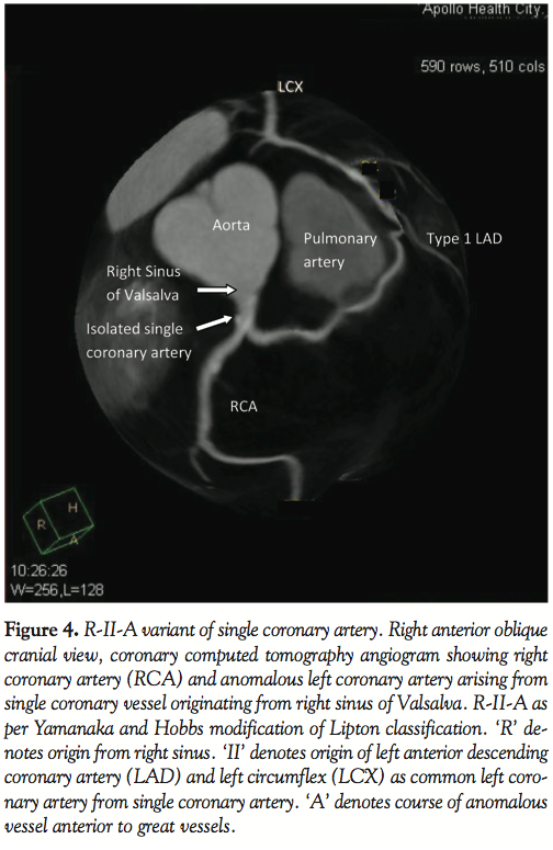 The overall incidence of single coronary artery disease in a series of consecutive angiograms is between 0.024%1 and 0.044%.2 An aberrant left main artery arising from a single coronary artery from the right sinus of Valsalva (R-II-A as per modified Lipton classification) was seen in 4 cases out of a series of 50,000 angiograms.3