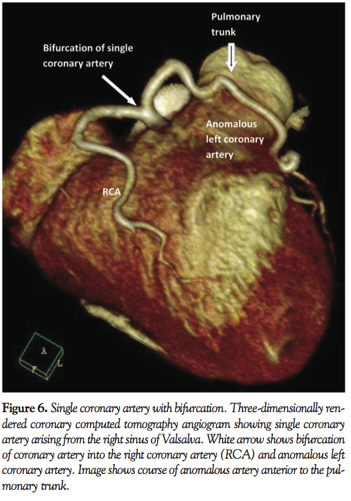 Prognosis of individuals with single coronary artery is uncertain, with no established treatment guidelines. In general, anomalies with right-sided origin and a pre-pulmonary course are considered harmless.4 Revascularization would be considered only with atherosclerotic changes and documented ischemia.