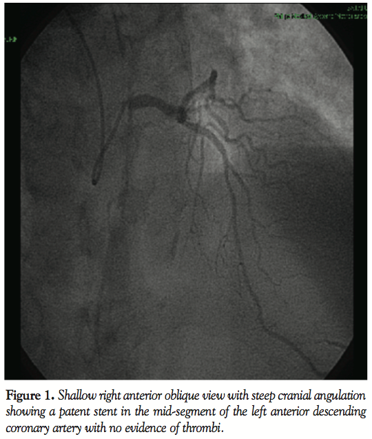 Case Report. A 62-year-old male patient presented to our emergency department in June 2009 with persistent ischemic-type chest pain for 3 H. He was an insulin-dependent diabetic, hypertensive, dyslipidemic, with chronic renal impairment. Electrocardiography revealed non-specific ST segment and T wave changes in the precordial leads, but no ST segment elevation. Cardiac biomarkers (cardiac troponin I and creatine kinase MB fraction) were elevated (cardiac troponin I measured 0.12 µg/mL; institutional upper limit of normal ≥0.1 µg/mL). After 2 days in the critical care unit, the patient was transferred to the cath lab. A coronary angiography via radial approach revealed a calcified type-B2 focal lesion in the mid-segment of a large-sized left anterior descending coronary artery (LAD), causing 95% luminal obstruction. Coronary angioplasty was performed under cover of bivalirudin (intravenous bolus followed by infusion). The patient received 600 mg of oral clopidogrel as a loading dose immediately following the procedure, according to our institutional protocol. Predilatation with a cutting balloon was initially performed, followed by the successful implantation of a 3.5 mm x 12 mm everolimus-eluting stent (Xience V, Abbott Vascular), deployed at 12 atm. In order to optimize the result in a calcified lesion, the operator performed post-dilatation with a 3.5 mm x 8 mm balloon inflated at 20 atm with a final TIMI grade 3 flow and 20% residual stenosis. The patient had an uncomplicated in-hospital course and was prescribed aspirin 100 mg daily indefinitely, and clopidogrel 75 mg daily, for 6 months after discharge (according to our institutional protocol following drug-eluting stent implantation). In a follow-up visit in August 2009, the patient was symptom-free, and echocardiography demonstrated a left ventricular ejection fraction of 70%, a left ventricular end-diastolic diameter of 55 mm, and no regional wall motion abnormalities.