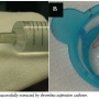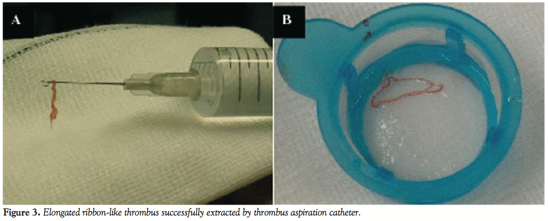 In January 2010, the patient discontinued clopidogrel. After 2 weeks, he experienced recurrent angina (Canadian Cardiovascular Society score II) and was admitted once again to our critical care unit. Nevertheless, electrocardiography was unremarkable, and cardiac biomarkers were within the normal range. In the context of multiple risk factors, the previously implanted stent, and more importantly, the recent discontinuation of clopidogrel, he was triaged for invasive study. Interestingly, coronary angiography revealed normal opacification of the index artery with no in-stent restenosis, and notably, no evidence of thrombosis (Figure 1). Obviously driven by a high index of suspicion, the operator decided to explore the artery with optical coherence tomography (OCT). Anticoagulation was achieved by enoxaparin 1 mg/kg intravenously (90 mg). Surprisingly, OCT (LightLab Imaging Inc.) discovered a ribbon-like thrombus starting in the proximal part of the stent and extending beyond its distal part. OCT was also able to clearly demonstrate a substantial proportion of uncovered and malapposed stent struts in the proximal part of the stent and a good deal of neointimal hyperplasia in its distal part (Figures 2A-2C). After a guidewire passage, thrombectomy was effectively performed using a thrombus-aspiration catheter, and a red thrombus was eventually extracted (Figure 3). Following thrombectomy, OCT confirmed adequate removal of the thrombus (Figure 2D). No balloon angioplasty was performed for stent malapposition because only a few malapposed struts were observed. Cardiac biomarkers were persistently negative at 6- and 12-hour intervals. The patient was kept on dual antiplatelet therapy in the form of aspirin 100 mg/d, and clopidogrel 75 mg/d for 12 months.
