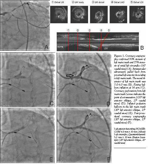 Coronary perforation occurs in 0.2% to 0.6% of PCI and is usually due to oversized dilatation, balloon rupture, and guidewire injury.1-6 Although surgery is necessary if bleeding from the artery remains uncontrolled, most perforation is successfully managed with prolonged balloon inflation.7,8 However, balloon inflation often takes more than 5-10 minutes to achieve hemostasis, which cannot be tolerated hemodynamically in the proximal coronary segment such as the left main trunk (LMT). In this case report, the perforation was successfully sealed immediately after 90 seconds of perfusion balloon inflation.