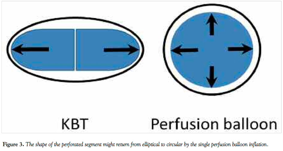 We experienced a case of coronary perforation sealed with a brief 90-second balloon inflation. While applying KBT onto LMT lesion, the size of balloons, application of ideal pressure, and the fact that the proximal lumen can take elliptical, not circular, shape need to be carefully considered.
