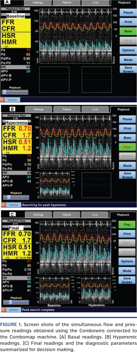 The aortic pressure (pa) and electrocardiographic (ECG) tracings were continuously recorded through the Combomap System (Volcano Therapeutics, Inc). Using a guide catheter, a 0.014˝ Combowire with a flow sensor at its tip and pressure sensor at 1.5 cm offset was advanced into the artery of interest. The pressure reading from the Combowire, while in the catheter, was equalized with pa before insertion into the artery. Next, the Combowire was advanced distal to the stenosis and placed at a location downstream to the stenosis and before any side branches. Baseline pressure and flow data were obtained using the Combomap machine (Figure 1A). Using intravenous adenosine 140 μg/kg/min as the stress-inducing agent, functional readings were obtained at hyperemia (Figure 1B). The parameters CFR, FFR, HSR, and HMR were obtained from the Combomap system (Figure 1C) based on the baseline and hyperemic readings.