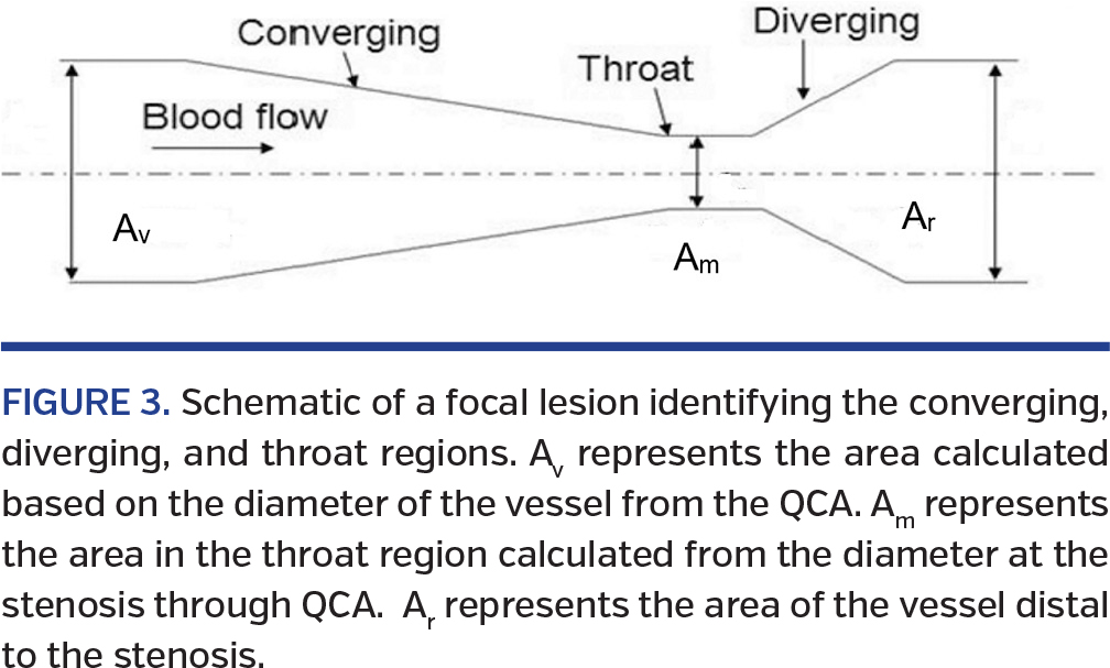 LFC calculation. As mentioned previously, LFC combines the lesion geometry (%AS, anatomical endpoint) and pressure and flow measurements (functional endpoints). LFC is defined as the ratio of the percent area obstruction to the square root of CDPm, which is the CDP calculated at the throat region of the stenosis (Figure 3):